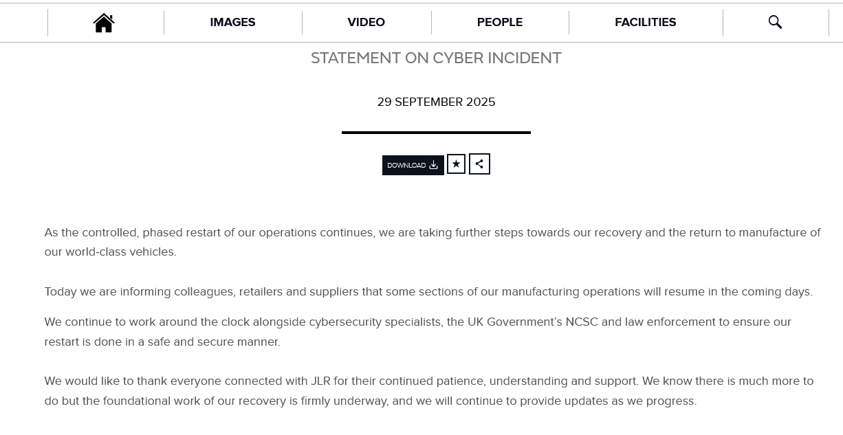 捷豹路虎宣佈將恢復因網絡攻擊停滯的部分製造業務