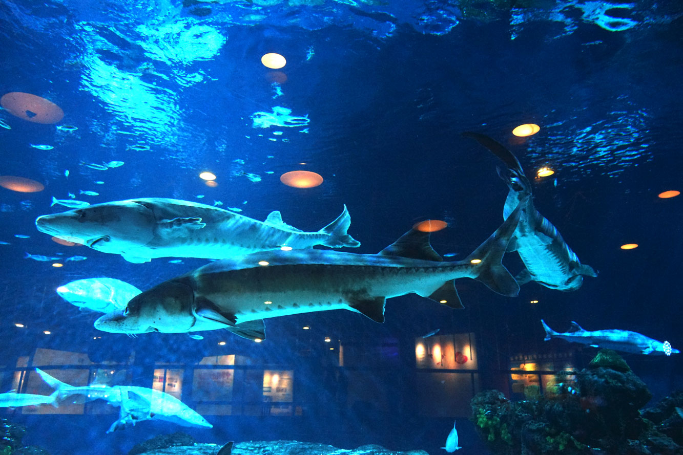 一尾尾大大小小的中華鱘優雅地游來游去,在展缸燈光的映照下,它們或龐大或微小的身體微微泛着光澤,眼睛明亮而有神。它們不時地靠近展缸玻璃,彷彿想要與外面的遊客們進行一場無聲的互動。