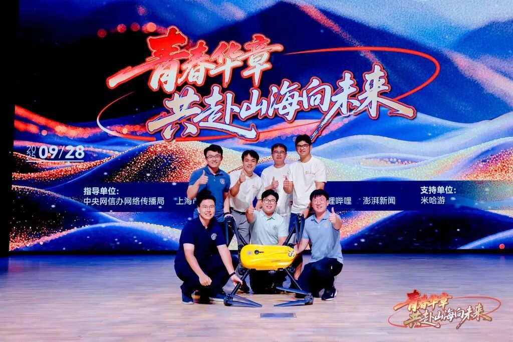 第三篇章“追夢·未來之約”展望未來。青年交警黃俊、上海創智學院和復旦大學聯合培養博士生王殿儀、派生萬物CEO孫揮以行動詮釋“我輩當為、強國有我”的時代擔當。上海交大團隊研發的海空兩棲無人航行器“哪吒”也來到展演現場,三位交大學子以脱口秀形式幽默分享了“哪吒”科研的背後故事,台上台下歡樂互動。當上海交通大學2012屆碩士畢業生,米哈遊創始人、總裁劉偉的視頻出現在大屏幕上時,交大學生一片歡呼。上海京劇院青年演員楊揚演唱的《原神》遊戲配曲《神女劈觀》,原汁原味的京劇唱腔和二次元的混搭在活動現場掀起一個高潮。