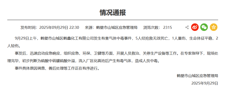 9月29日上午,鶴壁市山城區鶴鑫化工有限公司發生有害氣體中毒事件,5人經搶救無效死亡,1人重傷、生命體徵平穩,2人輕傷。