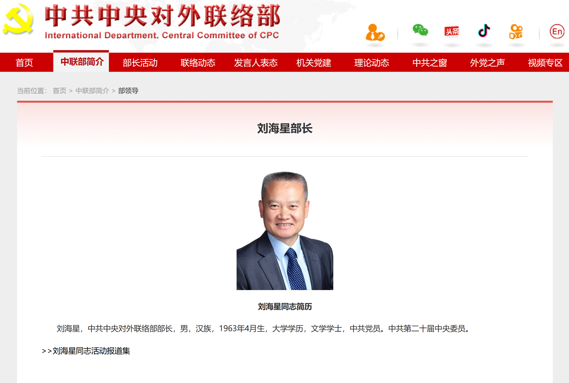 中共中央對外聯絡部網站“部領導”一欄最新信息顯示,劉海星已任中共中央對外聯絡部部長。