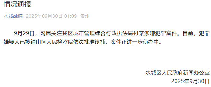 9月29日,網民關注我區城市管理綜合行政執法局付某涉嫌犯罪案件。目前,犯罪嫌疑人已被鐘山區人民檢察院依法批准逮捕,案件正進一步偵辦中。