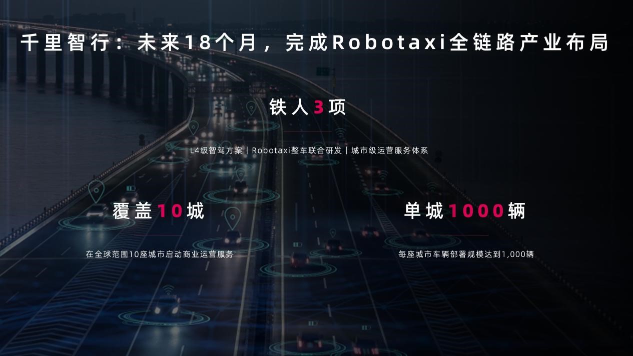 **智能出行。**目標在未來18個月完成Robotaxi全鏈路產業佈局,與吉利合作研發Robotaxi專用車型,並與國內外領先的出行服務提供商合作,未來希望在全球10座城市實現規模化的Robotaxi運營服務,在單一城市部署超過1000輛Robotaxi。