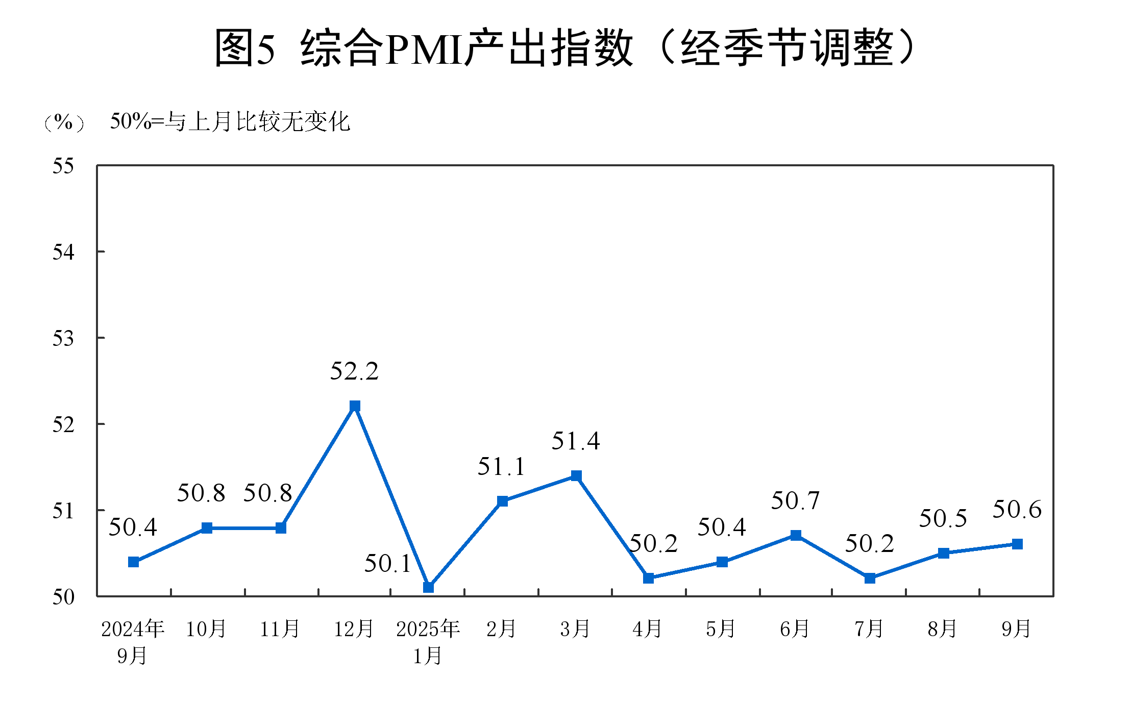 9月份,綜合PMI產出指數為50.6%,比上月上升0.1個百分點,持續高於臨界點,表明我國企業生產經營活動總體擴張繼續加快。