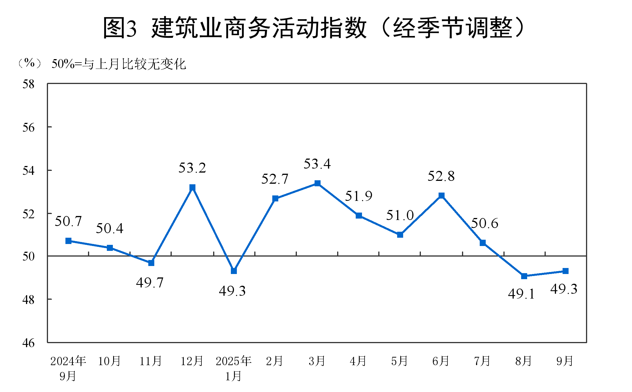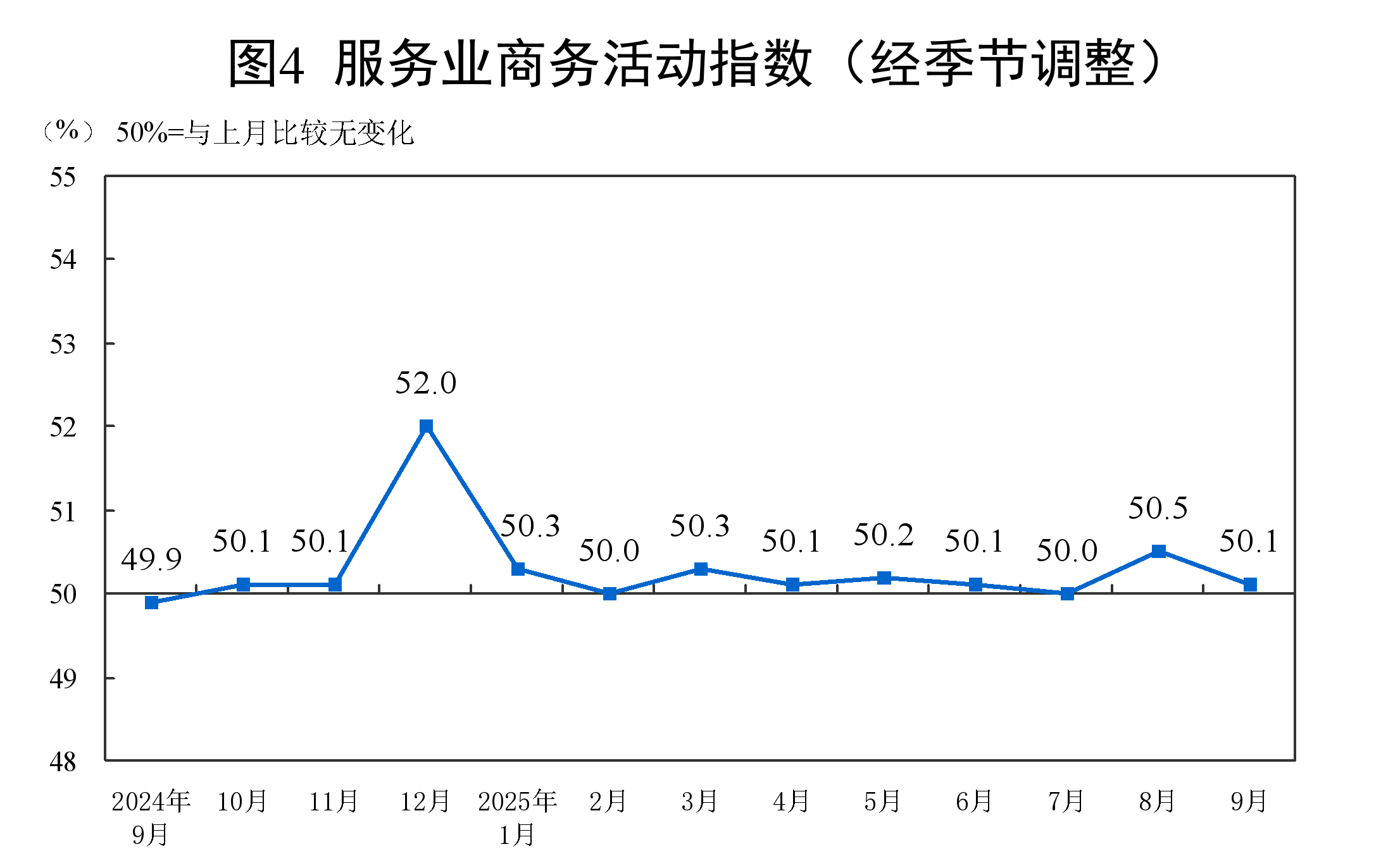 9月份,非製造業商務活動指數為50.0%,比上月下降0.3個百分點,位於臨界點,非製造業業務總量總體穩定。