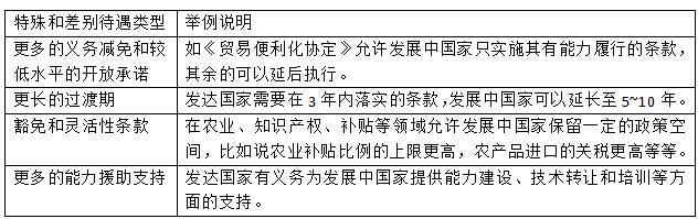 “特殊和差別待遇”是WTO協定體系中總結歷史經驗所作出的機制設定,發展中國家普遍享有。其法律基礎遍佈於各多邊協定中,如:《1994年關税與貿易總協定》(GATT)第18條(允許發展中國家為保護幼稚產業採取限制措施),《服務貿易總協定》(GATS)第4條(促進發展中國家參與服務貿易),《與貿易有關的知識產權協定》(TRIPS)第66條(給予最不發達國家更長的過渡期)。各類部長級會議決定、宣言(如《內羅畢決定》《巴厘島一攬子協定》等等)。
