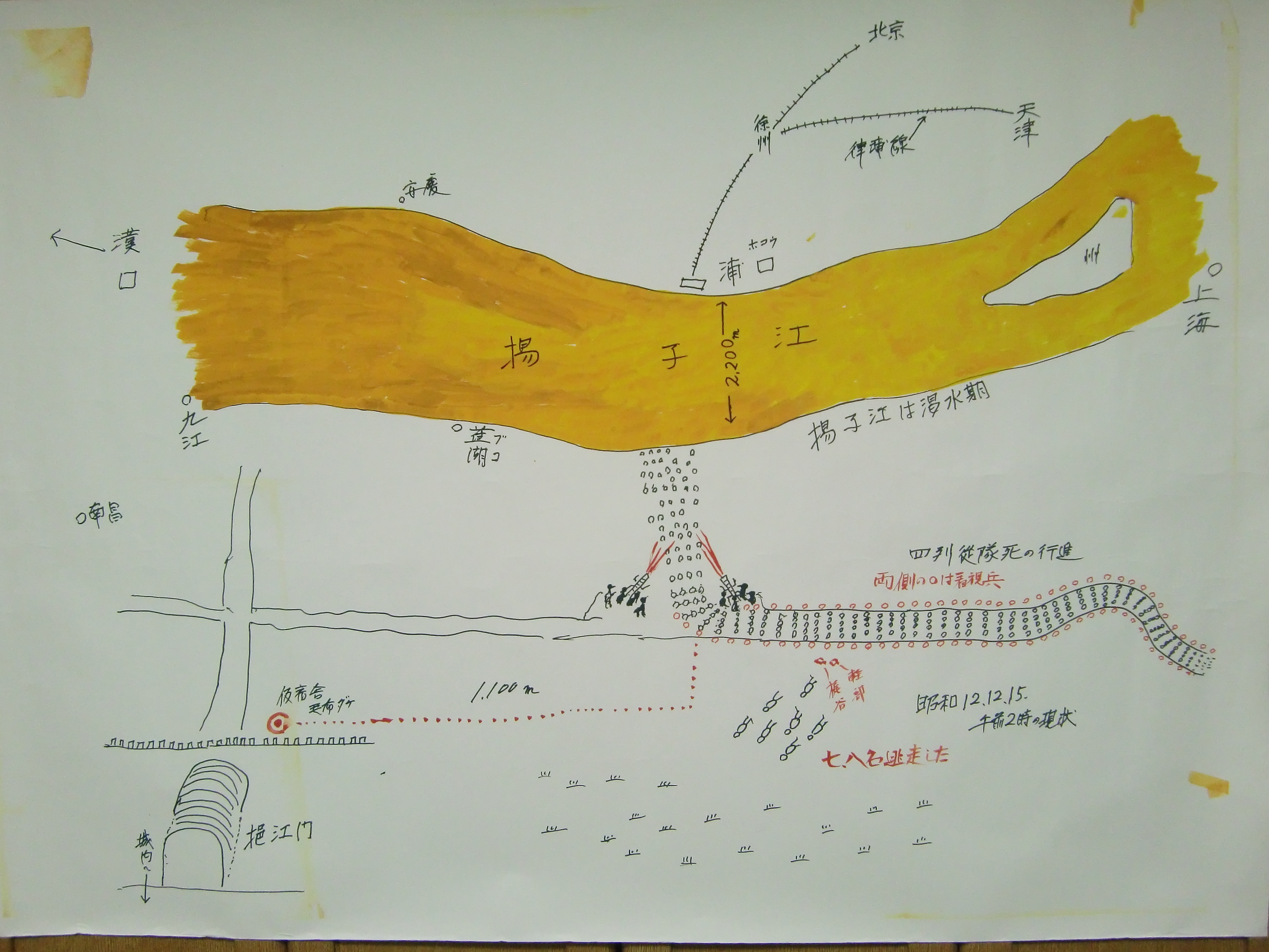 然而在這裏,日軍將押送過來的戰俘團團圍住,強迫他們朝着揚子江方向行進;這是一場死亡行軍,前方機槍陣地不斷朝他們射殺。他目睹3000餘名中國士兵被害,就在12月15日夜晚——那晚南京月色明亮,景象清晰可見。
