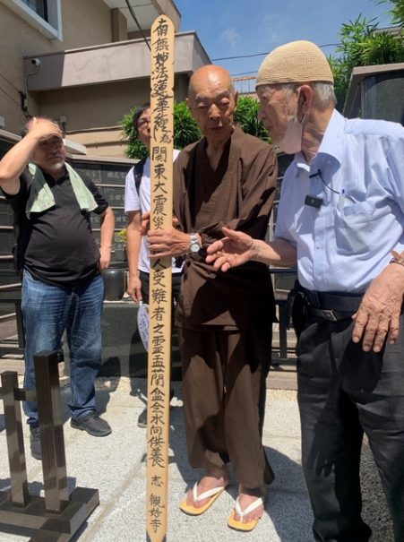 在大島町的觀妙寺,主持渡邊取出插在祭壇裏的一塊木板,上書“為關東大地震中國人受難者之靈盂蘭盆會水向供養”等字句。林伯耀説他找了很多寺廟,但只有這裏接受了祭奠中國受難者的請求。圖:南香紅/央廣網