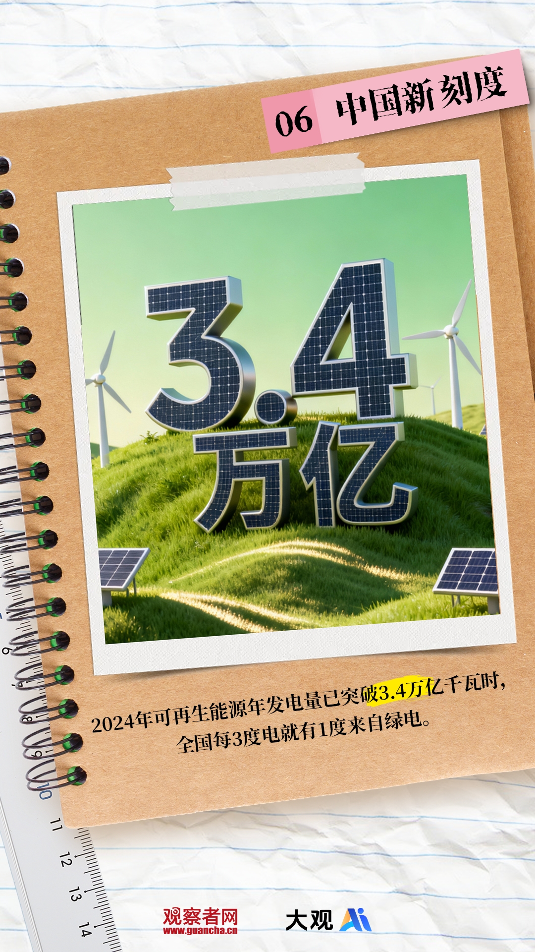 3.4萬億千瓦時——2024年可再生能源年發電量已突破3.4萬億千瓦時,當年全國發電量10.09萬億千瓦時,換言之,全國每3度電就有大約1度來自綠電。