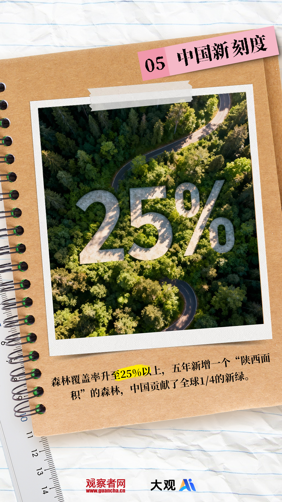 25%以上——森林覆蓋率升至25%以上,五年新增一個“陝西面積”的森林,中國貢獻了全球1/4的新綠。