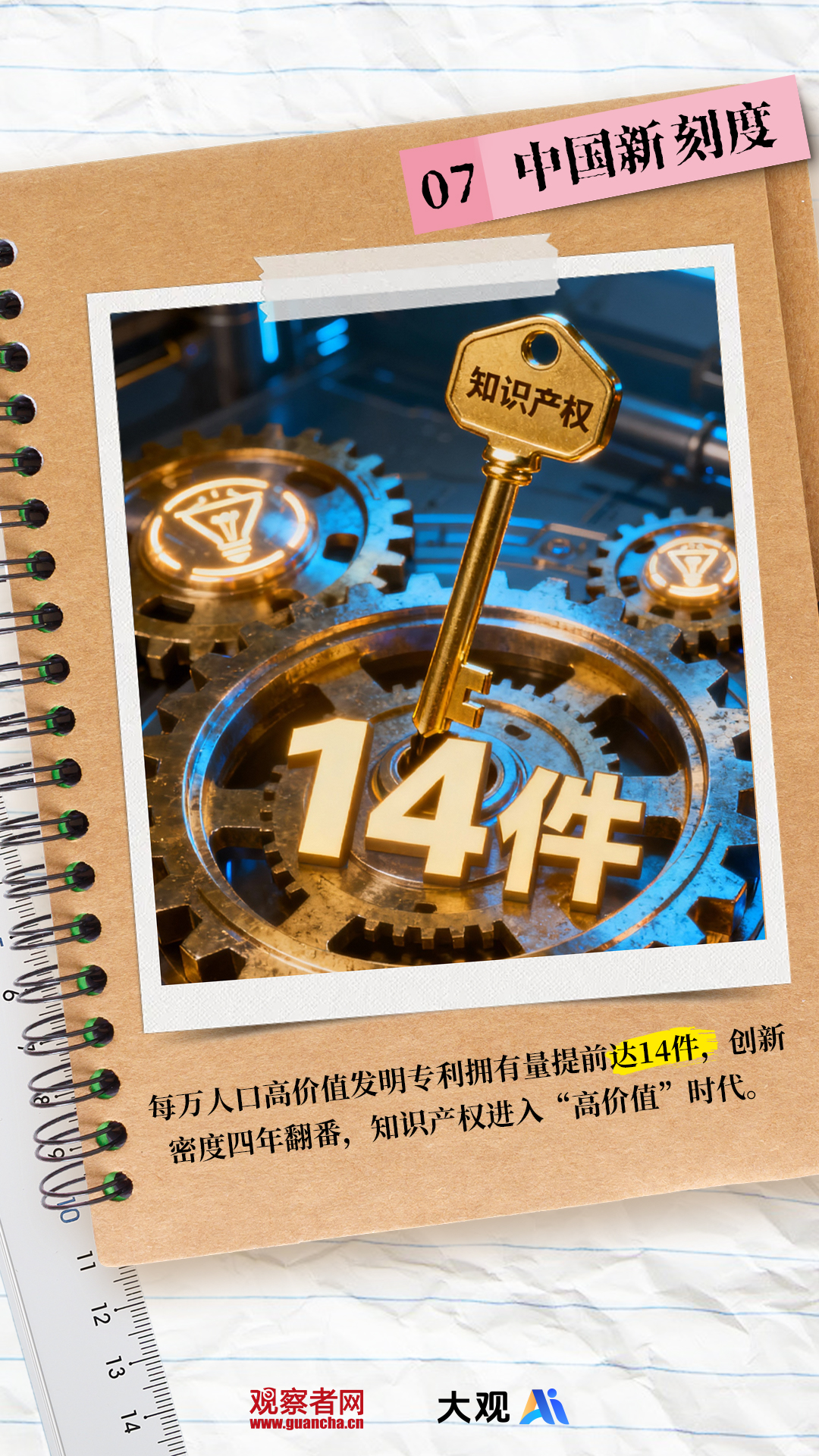 14件——截至2024年底,每萬人口高價值發明專利擁有量提前達14件,2020年底時為6.3件,創新密度四年翻番,知識產權進入“高價值”時代。