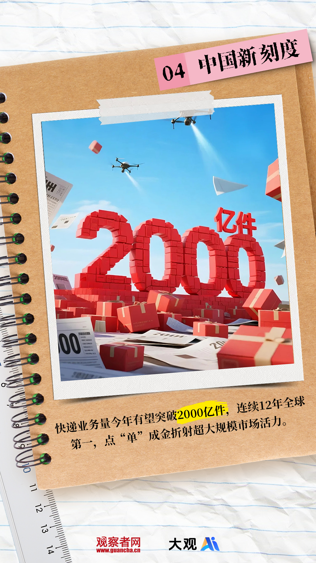 2000億件——快遞業務量今年有望突破2000億件,連續12年全球第一,點“單”成金折射超大規模市場活力。
