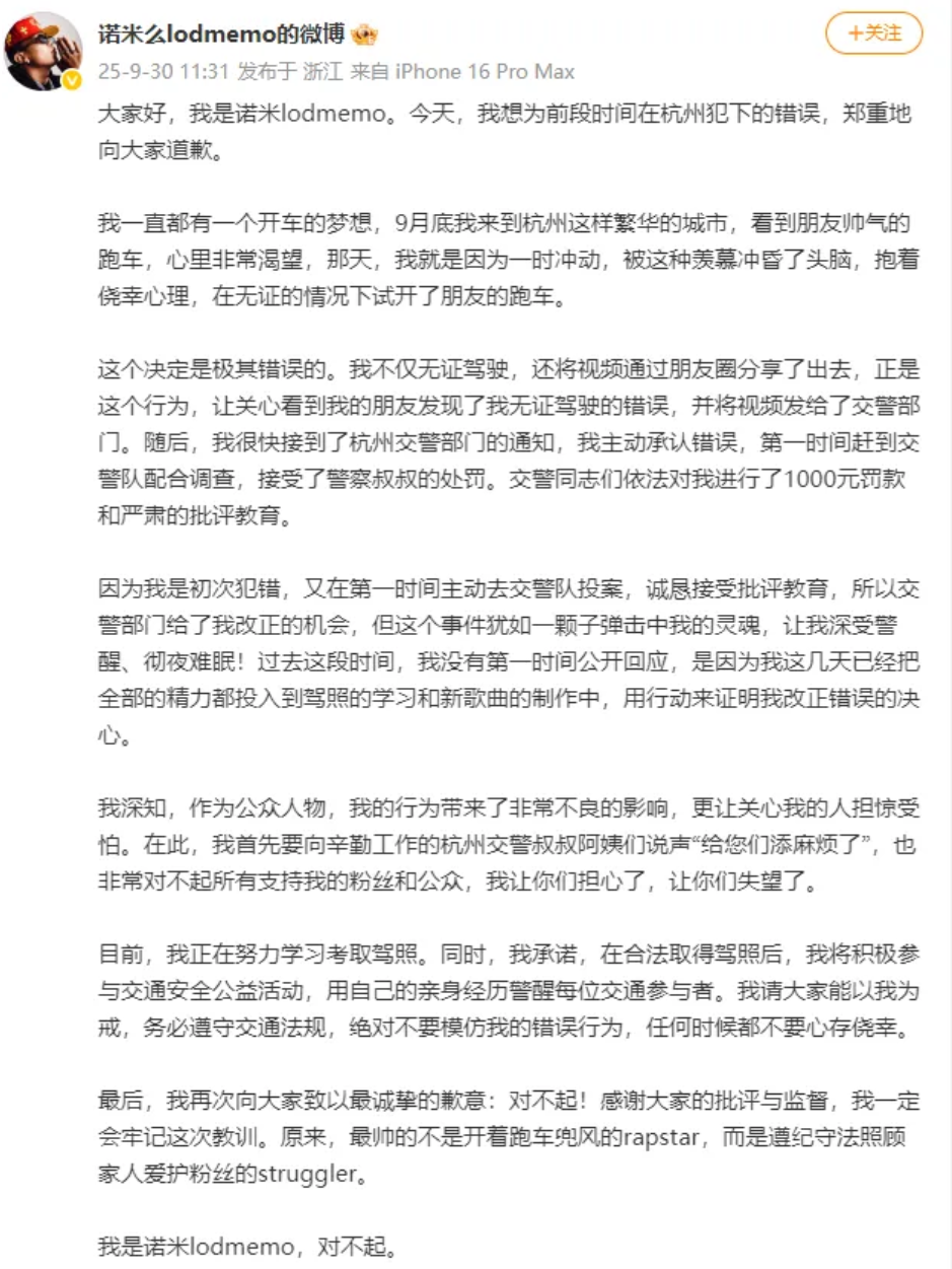 9月30日,説唱歌手諾米就無證駕駛發文道歉。