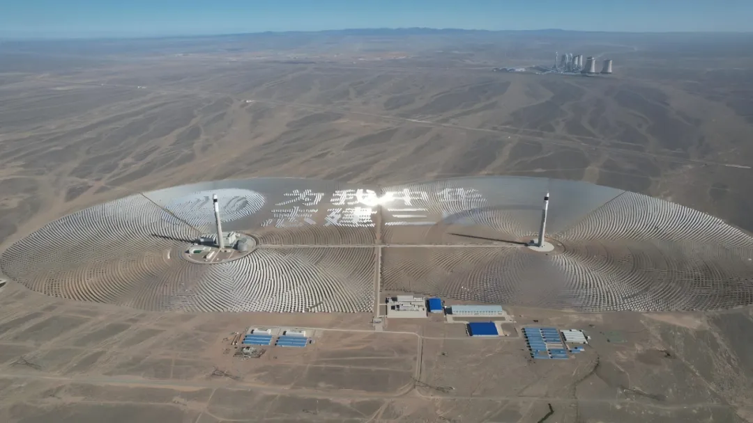 該光熱儲能電站裝機容量10萬千瓦,首次採用“兩座吸熱塔+一套汽輪發電機組”的創新配置。項目現場,兩座吸熱塔東西佈置相距約1千米。吸熱塔周圍,近2.7萬面定日鏡組成東西兩座部分重疊的圓形鏡場,總採光面積達80萬平方米。鏡面採用特殊超白玻璃,反射效率達94%,可跟蹤太陽轉動。東西鏡場重疊區域的定日鏡上午導光至東塔、下午轉向西塔,最大化捕捉光能,從而實現高效集熱。