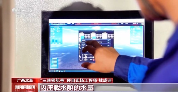 “三峽領航號”項目現場工程師 林成迪:在風機吊裝的過程中,浮體的動態壓載系統發揮着“智能平衡儀”的作用,我們通過調整浮體三支側立柱內壓載水艙的水量,讓浮體的水平度始終保持在千分之三以內。