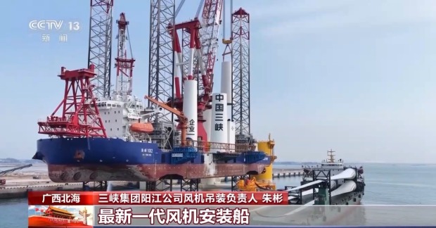 三峽集團陽江公司風機吊裝負責人 朱彬:此次吊裝是國內首次採用最新一代風機安裝船,在碼頭站樁完成施工,風機塔筒、主機葉片等設備預先運上風機安裝船,實現裝運一體化,為我國海上風電走向深遠海提供了重要技術實踐支撐。