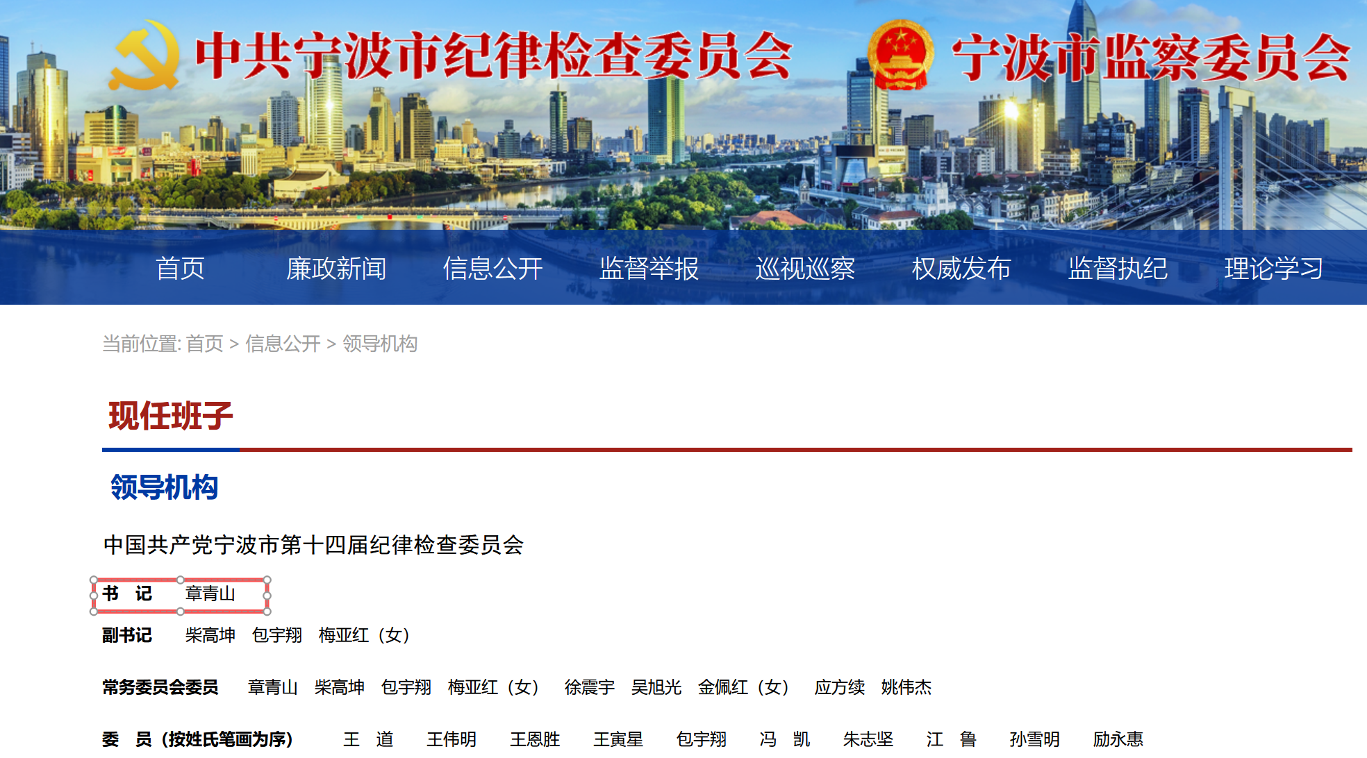 寧波市紀委網站“領導機構”欄目顯示,中國共產黨寧波市第十四屆紀律檢查委員會書記為章青山。