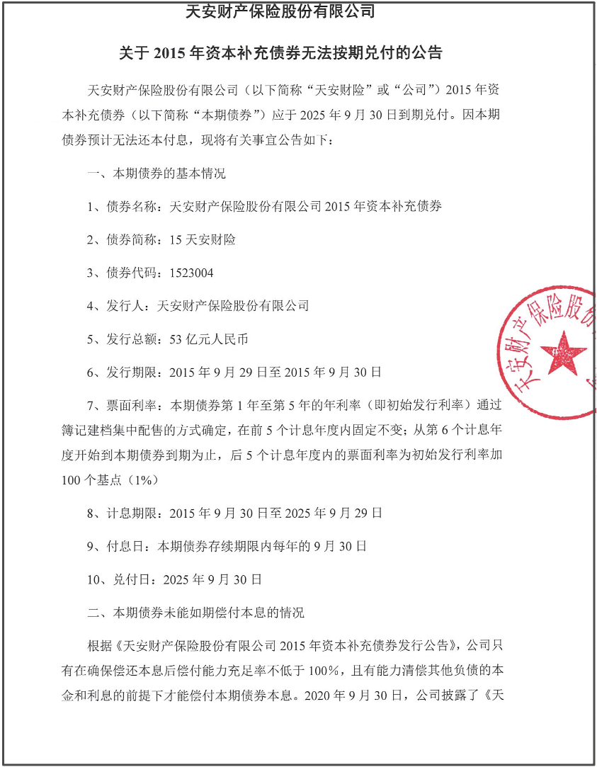 9月30日,天安財產保險股份有限公司發佈《關於2015年資本補充債券無法按期兑付的公告》。公告稱,該公司2015年資本補充債券應於2025年9月30日到期兑付,預計無法還本付息。