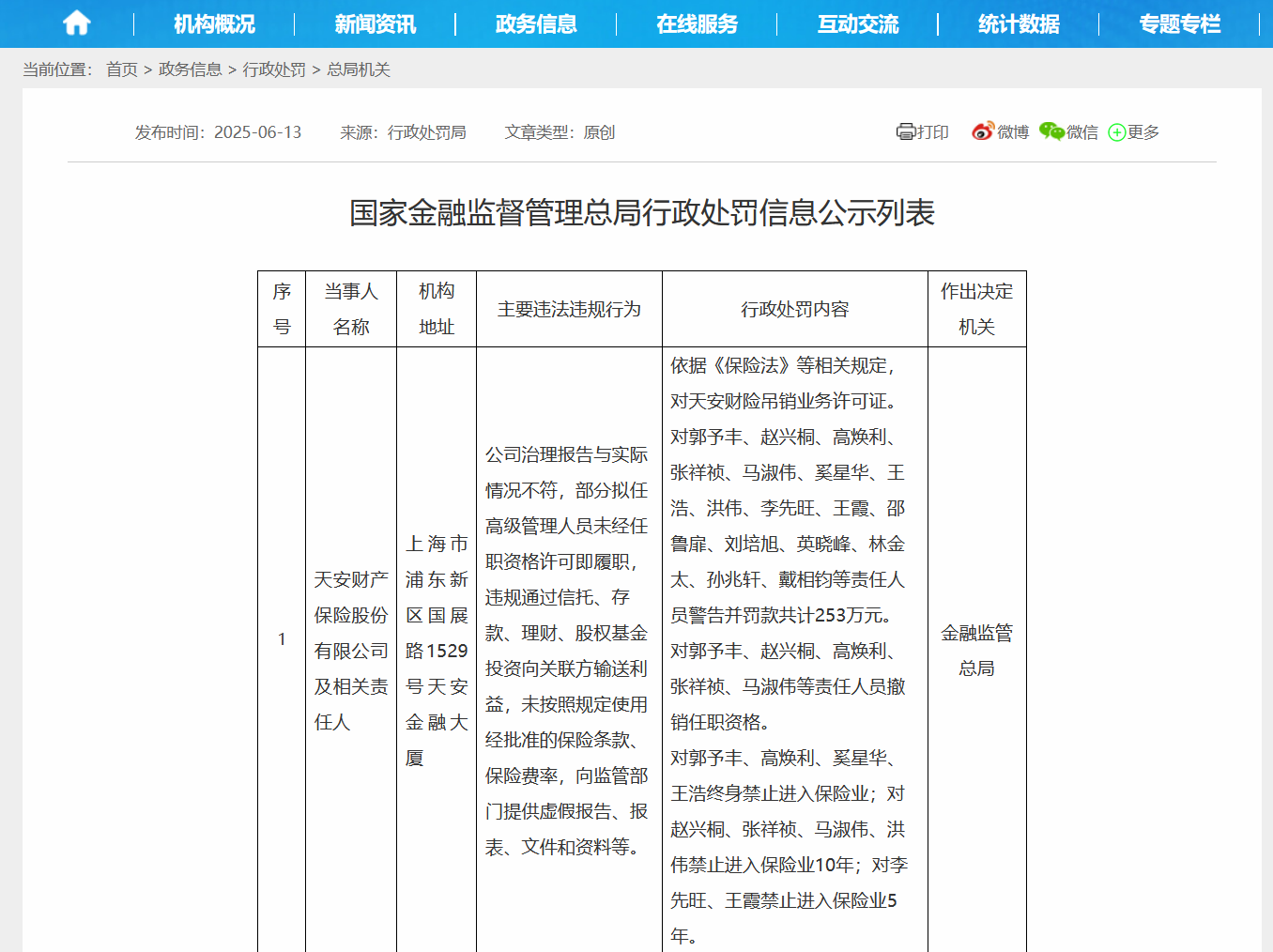 今年6月,國家金融監督管理總局公示的處罰信息顯示,天安財產保險股份有限公司及相關責任人存在下列情況:公司治理報告與實際情況不符,部分擬任高級管理人員未經任職資格許可即履職,違規通過信託、存款、理財、股權基金投資向關聯方輸送利益,未按照規定使用經批准的保險條款、保險費率,向監管部門提供虛假報告、報表、文件和資料等。