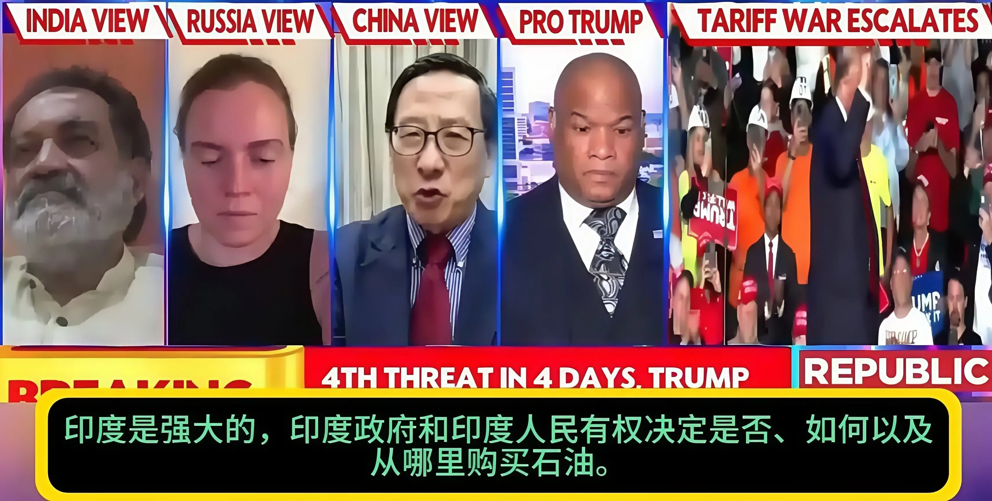 **高志凱:**特朗普在今年4月2日啓動的所謂“全球對等關税戰”,更是赤裸裸地對全球發起警示。在我看來,美國簡直像端着槍頂着各國的額頭和後腦勺:“你必須就範、你必須聽我的;我是霸主,我要發號施令、下最後通牒。你必須跪下,叫我爺爺或爸爸。”一時全球烏煙瘴氣,世界上有一大半國家被迫趴下。只有中國還直挺挺站着,後來印度也站了出來,與美國據理力爭。