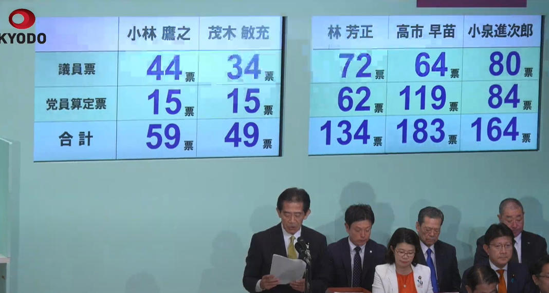 最終,高市早苗在第二輪投票中以185票戰勝小泉進次郎(156票),當選日本自民黨總裁。