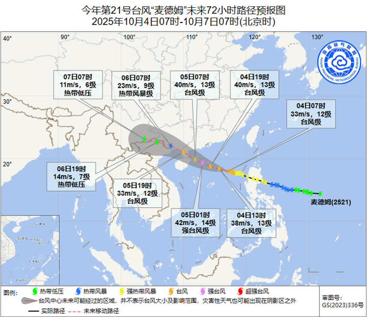 氣象台預報表示,今年第21號颱風“麥德姆”10月4日02時由強熱帶風暴級加強為颱風級,07時其中心位於北緯18.0度、東經117.1度,也就是在距離海南省文昌市東南方向約660公里的南海東部海面上,中心附近最大風力12級(33米/秒)。