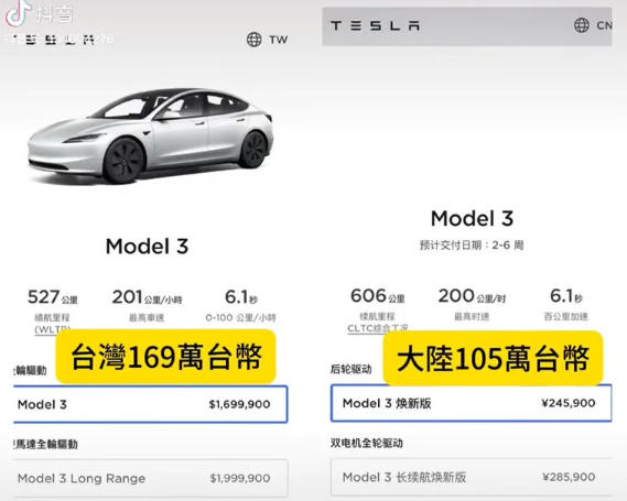 “特斯拉Model3,台灣169萬新台幣(1元人民幣約合4.26元新台幣),大陸105萬新台幣”
