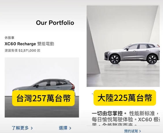 “沃爾沃XC60,台灣257萬新台幣,大陸225萬新台幣”