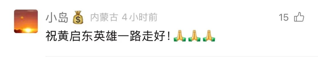 被救的辛先生父子經檢查無礙後,帶着全家登門致謝。“因為我沒有看好孩子,讓黃大爺付出了生命。”辛先生泣不成聲,“這份恩情,我們全家永生難忘。”黃啓東捨己救人的事蹟經報道後,感動了眾多網友,他們紛紛留言。