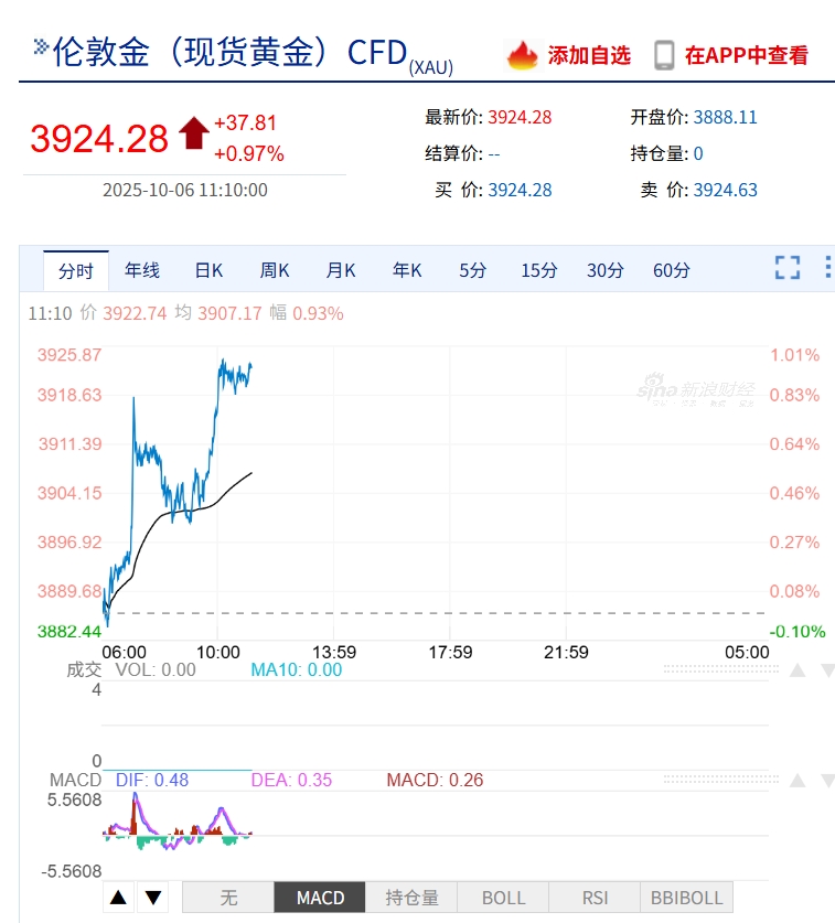 10月6日,黃金價格再創新高。截至發稿時,倫敦黃金市場每盎司黃金價格已經突破3924美元,再漲近1%。