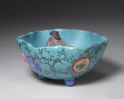 故宮博物院藏清代宜興窯綠地粉彩公道杯側看與俯瞰的狀態。