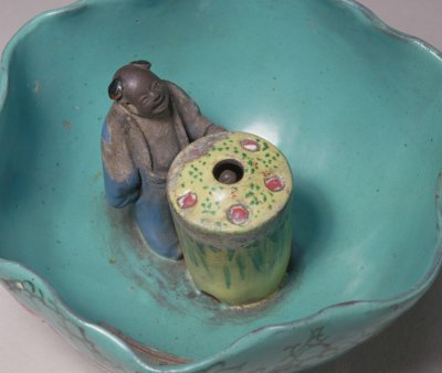 杯內中央為一條中空的黃彩圓柱,一位仙人抵柱而坐。圓柱根部有一處進水口,內部安有一條活動的紫砂陶質細長浮柱,那條浮柱採用壽星的造型。圓柱的頂面均勻分佈五個紅點,在宴會上,那五個紅點分別指向在座的飲酒之人。當酒慢慢倒入杯中時,圓柱中之浮柱緩緩上升,逐漸露出壽星的形象。上升過程中會自然地發生轉動,就導致壽星的面向有變化。一旦停止注酒,壽星面對哪個紅點,便由相對應之人飲酒。浮柱的下部標有刻度,隨着酒越注越多,壽星不斷浮起,最終會露出刻度。而如果當刻度露出時依然繼續斟酒,酒就會從仙人身下的小孔處流出杯底。(轉自故宮博物院官網)