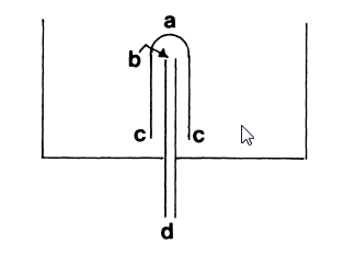 如圖為一支單頭虹吸管。可能有若干銅絲焊接在長管a-cc和長管bd之間,以此讓二管連在一起。長管bd穿透容器f的底面,管與容器底面必須接合嚴密,不能有縫隙。液體倒入容器,當液麪上升至點b時,第一滴水的泄落,便讓空間ad內的氣壓降低到足以令液體持續通過管bd流動,直到液麪降至cc處。這種虹吸管與現代馬桶沖水箱中的應用方式非常相似,不同之處在於後者是通過突然提升覆蓋下管道的鐘形罩來產生真空。