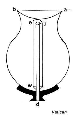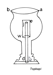 我們想解釋一下,如何製作一支敞口高腳杯(ka’s),向杯裏倒入一定量的酒水之後,只要再倒下適量的酒或水,那麼杯裏酒水就會流光。其樣式為:在杯ab中豎立一根長管dj,管子的末端d焊接到杯下部支足的底面上(本文作者按:d應該穿透底面,形成透孔,但原文未予説明),而另一端j高至杯的頂部。然後在該管之上固定另一支長管ew,該管將管jd套住,其頂端e為封死狀態,而另一端w則是開口,懸在接近杯底面之處。