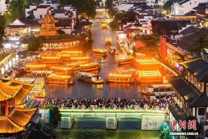 10月5日,江蘇南京,遊客們在城南夫子廟景區遊覽。(無人機照片) 中新社記者 泱波 攝