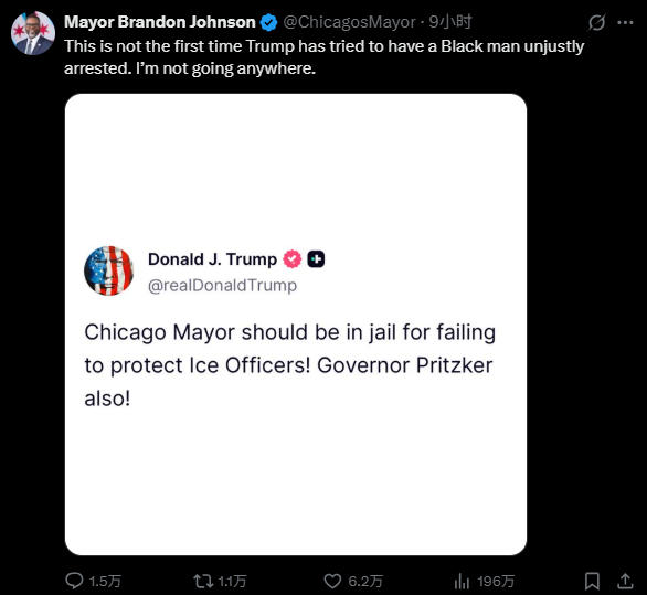 作為非裔民主黨官員,約翰遜在社交媒體X平台發文回懟稱:“這不是特朗普第一次試圖不公正逮捕一名黑人男子。我哪兒也不會去。”6日,約翰遜簽署了一項行政命令,創建“無ICE區”,禁止移民官員使用城市財產在芝加哥開展行動。
