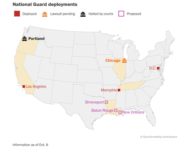據美國《華盛頓郵報》總結,截至當地時間8日,特朗普政府已向波特蘭、洛杉磯、芝加哥、華盛頓特區、孟菲斯等城市部署國民警衞隊,其中波特蘭的行動已被法院阻止,芝加哥市政府已上訴。