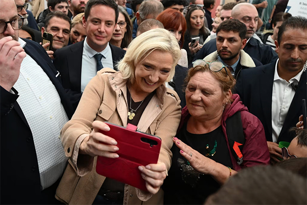 當地時間10月8日,法國極右翼政黨國民聯盟領導人瑪麗娜·勒龐與支持者自拍。 視覺中國