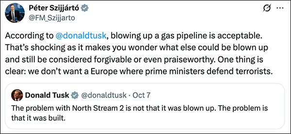 西雅爾多·彼得8日轉發了圖斯克的帖子並寫道,“根據圖斯克的説法,炸燬天然氣管道是可以接受的。這一説法令人震驚,不禁讓人懷疑,還有什麼事物是可以被炸燬卻仍被認為是可原諒的,甚至是值得稱讚的”。