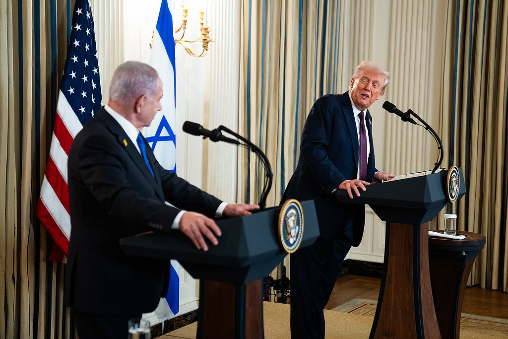 當地時間9月29日,美國總統特朗普和以色列總理內塔尼亞胡在白宮國宴廳舉行記者會。視覺中國