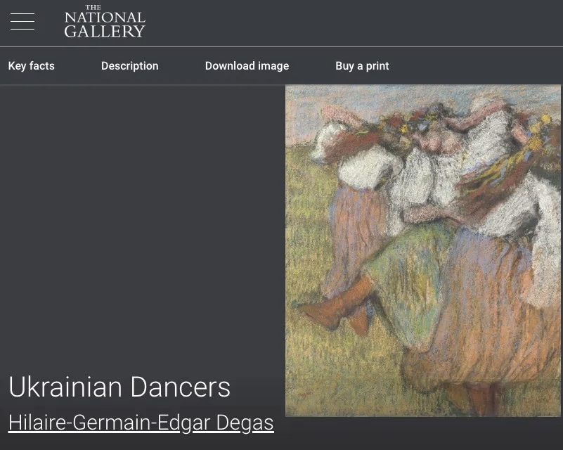 西方甚至連同俄羅斯有關的畫兒、貓兒、樹兒也要制裁。倫敦國家美術館2023年將法國印象派畫家德加的畫作《俄羅斯舞者》更名為《烏克蘭舞者》,這幅畫描繪三名系藍黃絲帶的舞者,美術館稱 “藍黃兩色象徵烏克蘭國旗”,故而更名。可問題是,該畫創作於1899年,當時烏克蘭屬俄羅斯帝國,“烏克蘭國旗”尚不存在。