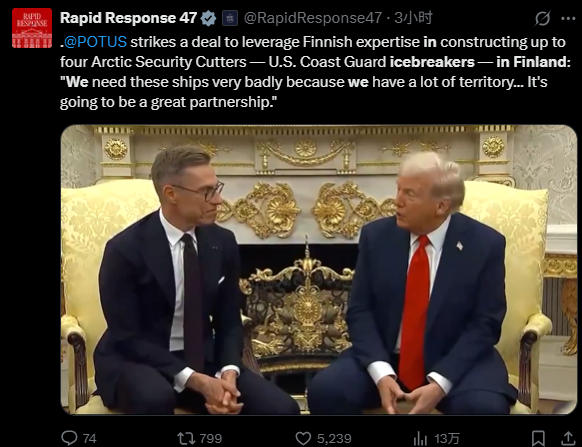 “我們正在購買世界上最好的破冰船,而芬蘭以製造破冰船而聞名,”特朗普在白宮橢圓形辦公室表示,“我們將在很大程度上共同建造。我們在芬蘭建四艘,在美國建七艘。”