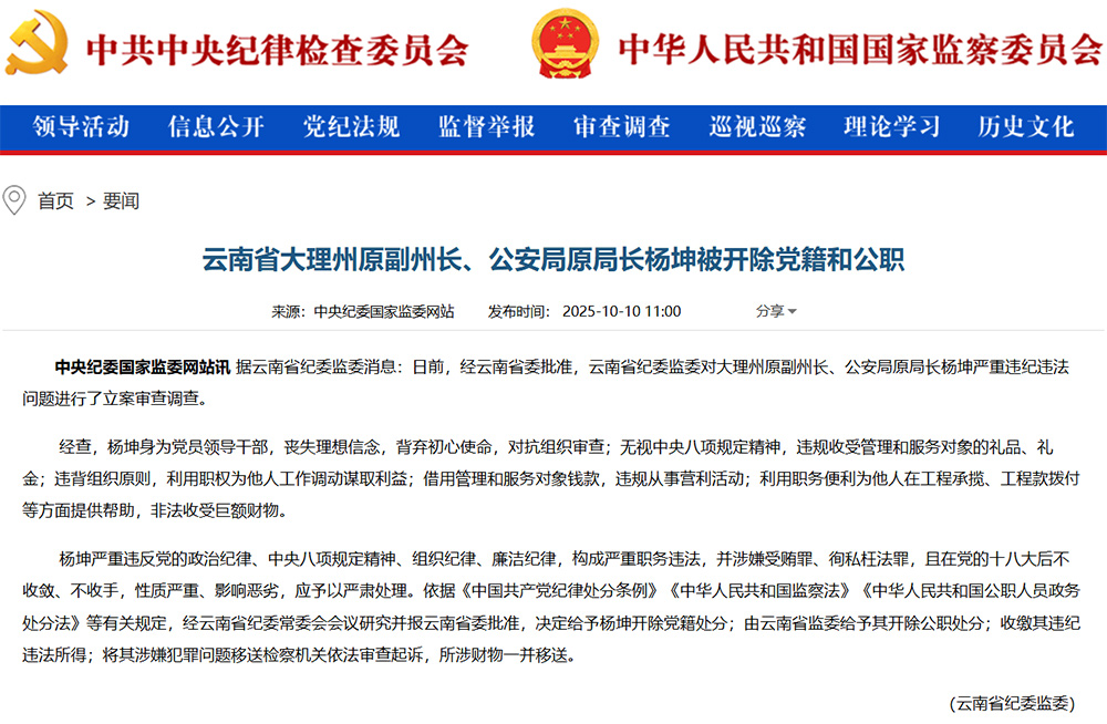 據中央紀委國家監委網站10月10日消息,據云南省紀委監委消息:日前,經雲南省委批准,雲南省紀委監委對大理州原副州長、公安局原局長楊坤嚴重違紀違法問題進行了立案審查調查。