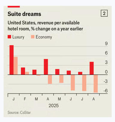 報道稱,美國房地產數據公司CoStar Group的統計顯示,今年以來,豪華酒店每間可用客房收入每月均高於去年同期,而經濟型客房收入則普遍下降。美國摩根大通集團(JPMorgan Chase & Co.)旗下的大通旅行社(Chase Travel)數據也表明,今年6月至8月,頭等艙機票預訂量同比增長超過20%。此外,國際航空數據公司IBA(International Business Aviation)預測,今年全球將交付約820架私人飛機,增幅達7.3%。