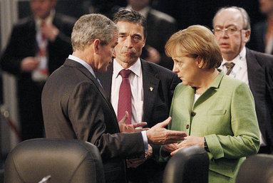 2008年的北約布加勒斯特峯會上,美國總統小布什與德國總理默克爾交談。