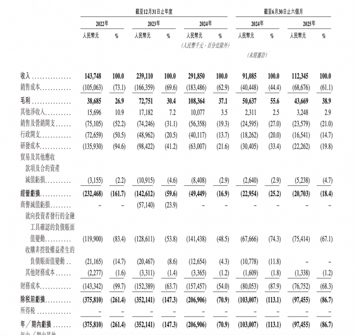 具體來看,在2022年至2024年,森億智能收入分別為1.44億元、2.39億元、2.92億元;期內虧損分別為3.76億元、3.52億元、2.07億元;毛利率分別為26.9%、30.4%、37.1%。