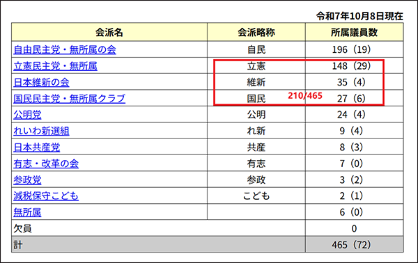 同一天,日本維新會也釋放出合作信號。大阪府知事吉村洋文公開表示,“如果立憲民主黨決定支持玉木參選,維新會願意就投票事宜與立憲民主黨及國民民主黨進行磋商。”若這三黨成功結盟,其議員票總數雖仍不足過半,但仍將超越自民黨單獨掌握的議席。