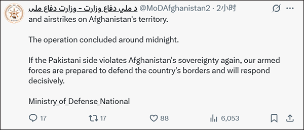 此外,阿富汗國防部也在X平台上發表了類似聲明,重申此次襲擊是針對巴基斯坦“侵犯阿富汗領空”的報復行動。