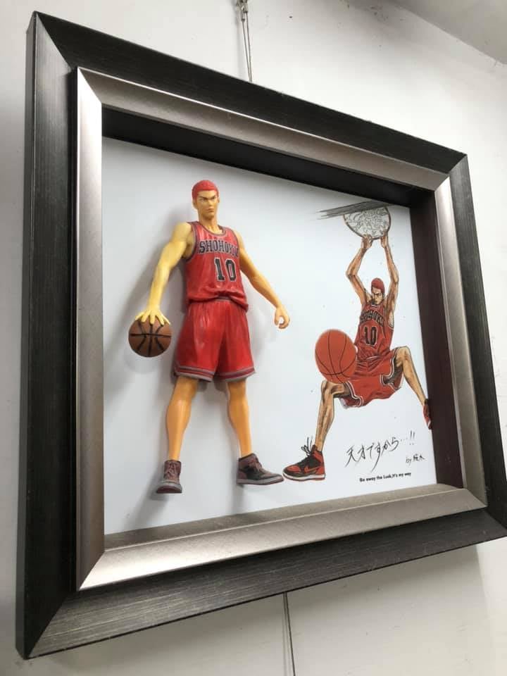 當然,搜索引擎對家庭小店的忽視,並不能反映它的“奮鬥”。點進圖冊裏瀏覽,除了部分客户上傳的,更多的是王氏自己展示的新圖片和簡介視頻。裏面還有結合手辦與繪畫的《灌籃高手》裝飾畫,是王苡儒大約在2021年的作品。