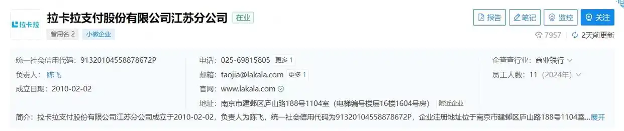 企查查顯示,拉卡拉支付股份有限公司江蘇分公司成立於2010年2月2日,負責人為陳飛,所屬行業為商務服務業。總公司是拉卡拉支付股份有限公司,該公司成立於2005年,董事長為孫陶然,公司於2019年4月在深交所上市,股票代碼300773。近期,拉卡拉在股東結構方面出現變動,聯想控股和孫浩然分別減持股份,持股比例分別降至23.97%和0%,但公司強調這些變動不會影響治理結構和控制權。此外,該公司進行了資產調整,擬轉讓三家全資子公司股權,涉及關聯交易。